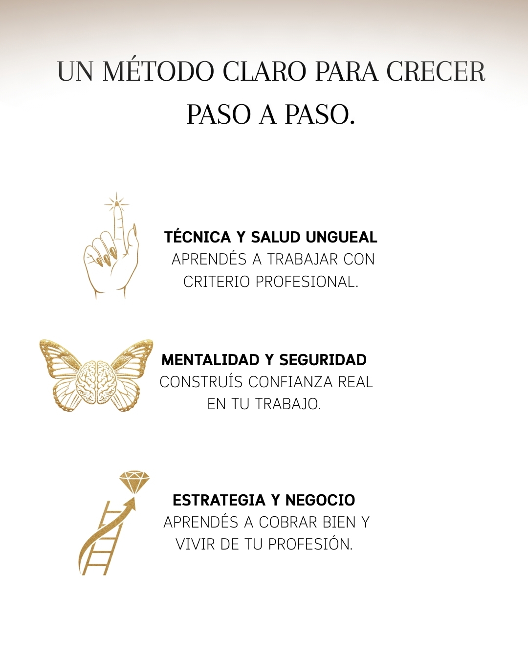 Enseña criterio profesional, salud ungueal, mentalidad y estrategia real.